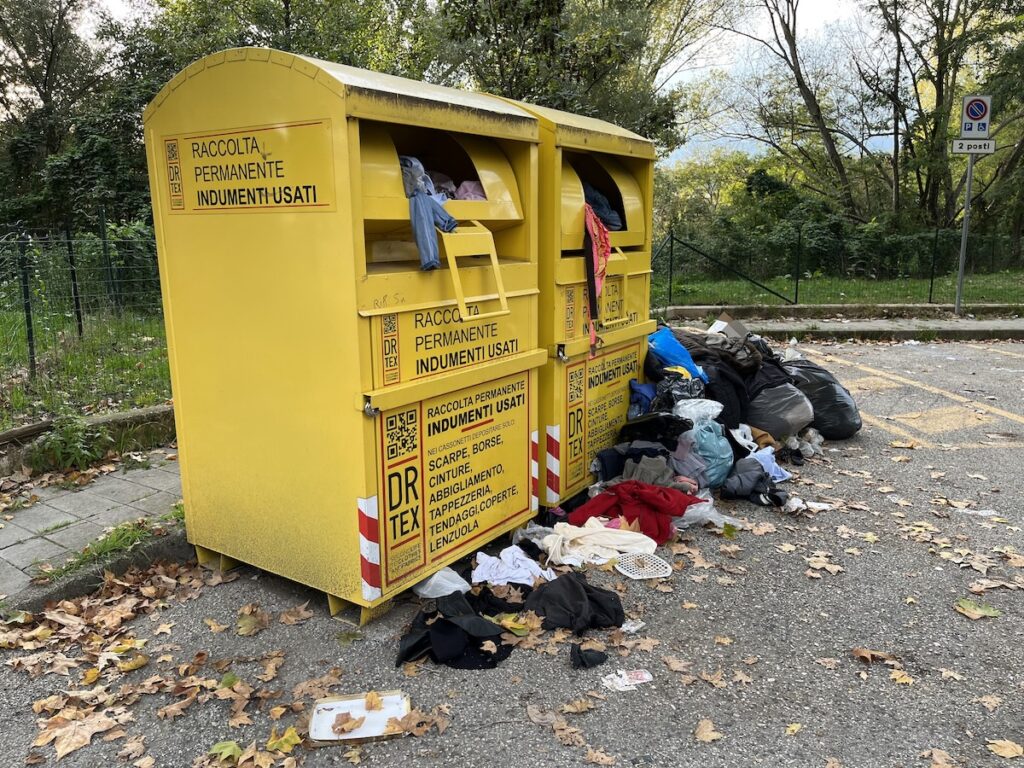 Ancora una volta intorno ai cassonetti per gli abiti usati si assiste ad uno spettacolo indecoroso, vecchi indumenti misti ad altri rifiuti abbandonati in gran quantità.