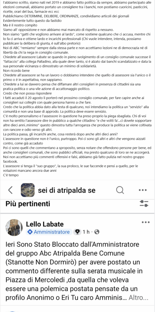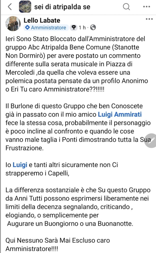 A questo punto è comparso sul gruppo “sei di atripalda se” un post dello stesso Labate che denunciava il ban subito altrove:
