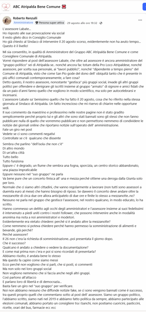 Se vi abbiamo riportato la questione è perché Renzulli, in un lungo post di risposta a Labate (ve lo riportiamo in foto), ha menzionato uno spiacevole episodio successo il 20 agosto il cui protagonista è stato lo stesso Assessore e di cui ha promesso voler dibattere nel prossimo consiglio comunale che sarà convocato.