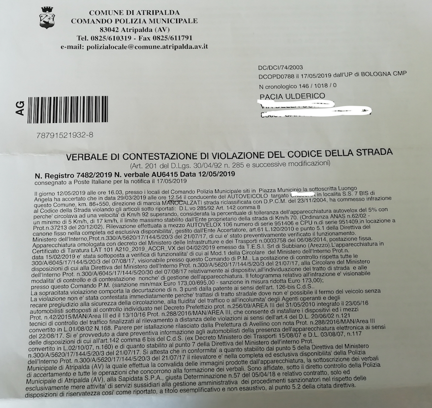 “Non è mia intenzione alimentare nessun tipo di polemica, anche perché sul dispositivo autovelox si è parlato e dibattuto in tutte le sedi possibili ed immaginabili. Fermo restando il mio errore nell’aver percorso il tratto di strada, dove è posizionato il dispositivo, ad una velocità maggiore rispetto al consentito, qualche dubbio rimane. Nel verbale di contestazione che mi è stato recapitato, mi si contesta una velocità molto superiore al consentito, per la precisione di 92 Km/h. Nonostante l’età, la lucidità per fortuna mi accompagna ancora tutt’oggi, posso affermare che in quel tratto non ho mai, né prima né dopo l’apposizione del dispositivo, superato gli 82 km/h. Non vorrei che il dispositivo avesse delle anomalie. Sarà mia premura ricorrere presso le sedi opportune per la contestazione e l’annullamento della contravvenzione ricevuta, inoltre, mi documenterò a dovere per sapere se è possibile chiedere a chi di competenza la verifica del dispositivo sulla rilevazione della velocità.”
