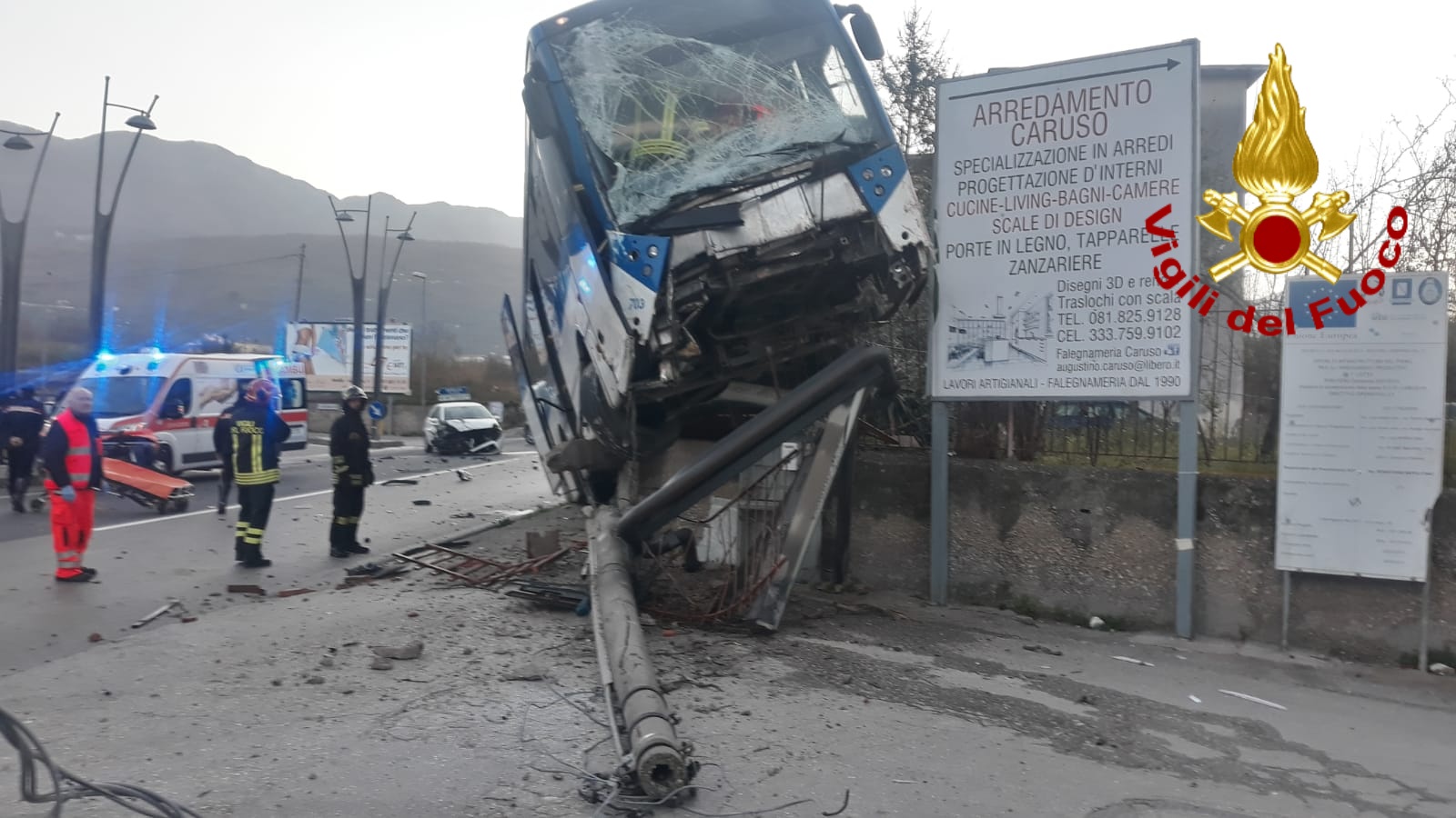 In seguito al violento impatto tra i due veicoli, l’autobus ha abbattuto un palo in cemento della linea elettrica e delle insegne pubblicitarie, finendo la sua corsa su di un muro di recinzione.