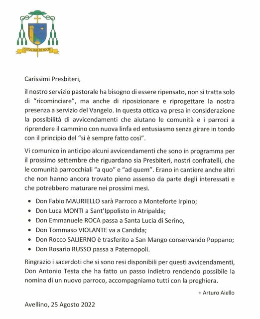 Ma mi premeva avvisarvi e chiedervi una preghiera per me e per colui che mi sostituirà: Don Luca Monti, dalla parrocchia di Santa Lucia di Serino. Noi preghiamo per voi.