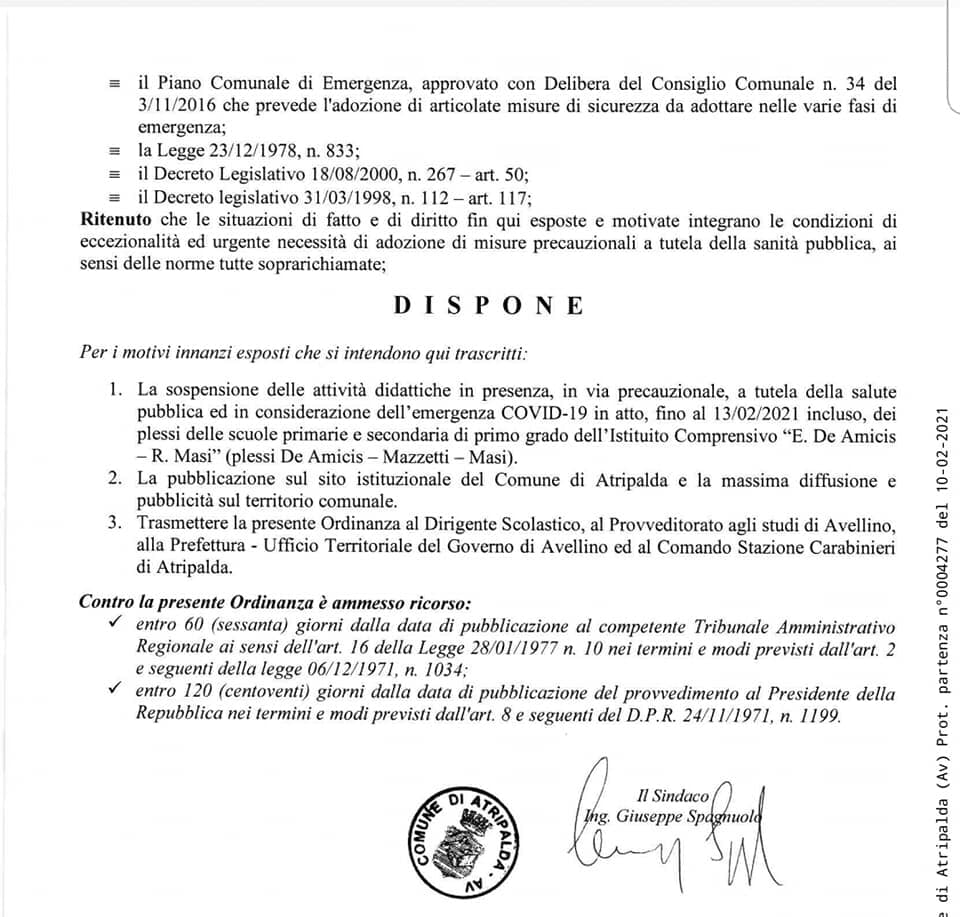 Con una nuova ordinanza il Sindaco di Atripalda Giuseppe Spagnuolo ha deciso di chiudere le scuole fino al 13 di febbraio 2021.