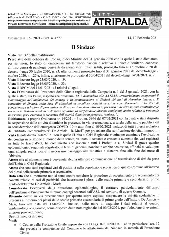 Di seguito l’ordinanza n° 16 emessa il 10 febbraio 2021.