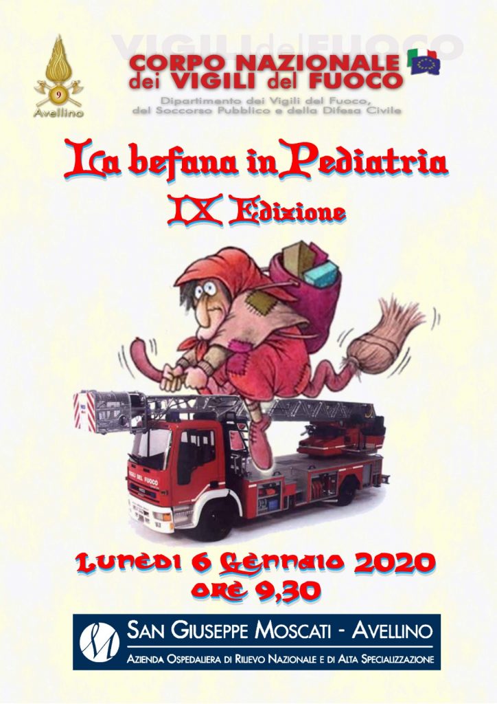 In occasione della festività dell’Epifania del 6 gennaio 2020 alle ore 09.30, il personale dei Vigili del Fuoco di Avellino, farà visita al reparto di Pediatria dell’Ospedale “Moscati”, per consegnare regali e dolciumi.