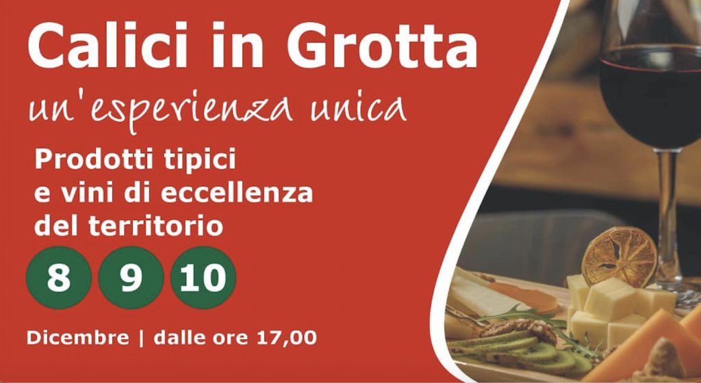 Nei giorni 8, 9 e 10 dicembre 2023 spazio anche all’iniziativa Calici in Grotta con prodotti tipici e vini di eccellenza del territorio appuntamento dalle ore 17.00.