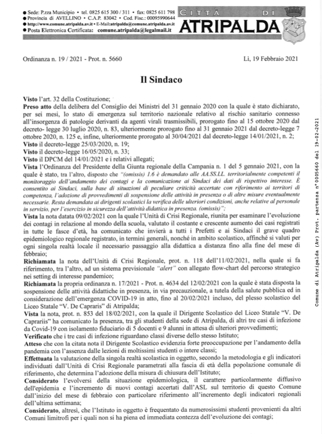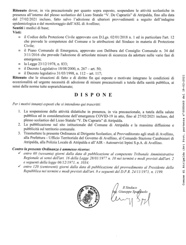 Con una nuova ordinanza il Sindaco di Atripalda ha prorogato la chiusura del Liceo Statale De Caprariis di Atripalda.