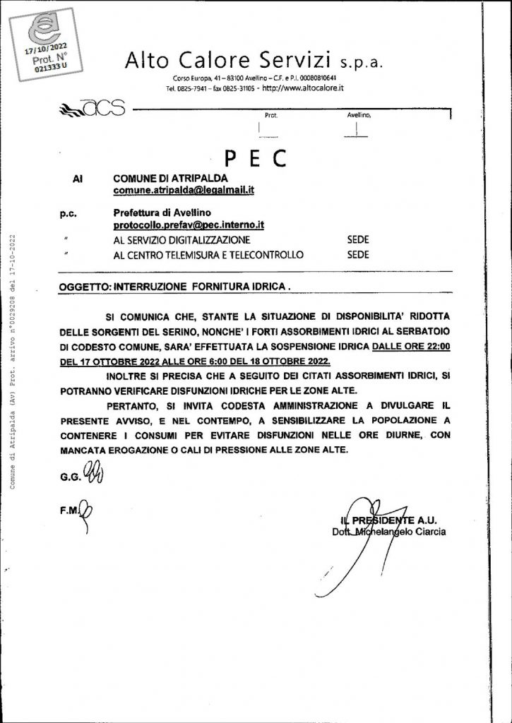 L’Amministrazione comunale informa la cittadinanza che dalle 22.00 di oggi 17 ottobre, alle ore 06.00 del 18 ottobre 2022, sarà effettuata la sospensione idrica su tutto il territorio comunale.